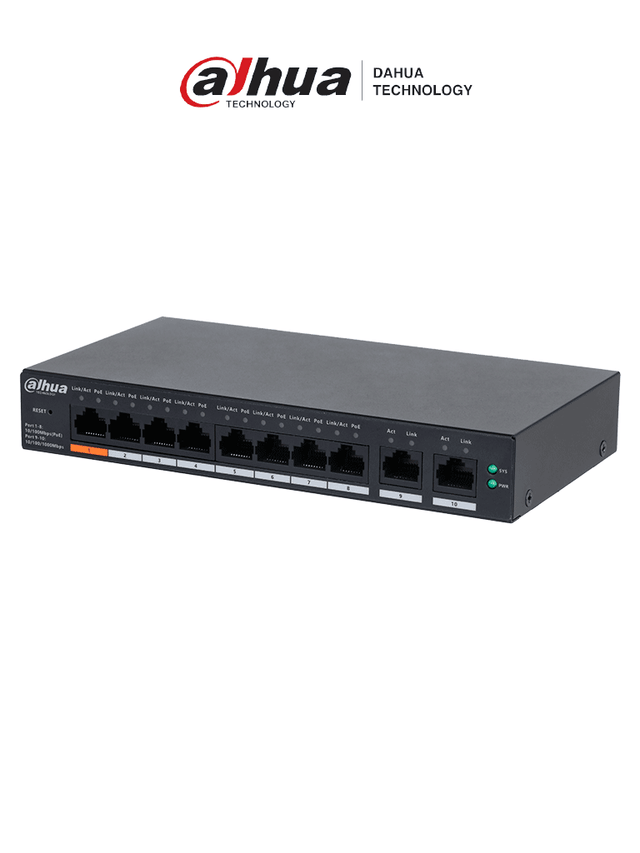 Switch PoE Dahua DH-CS4010-8ET-60: 8 Puertos, 60W, 2 Uplink, 4.8Gbps, Protección Descargas